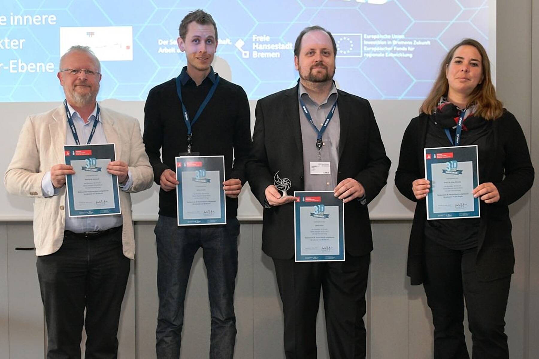 Das grenzübergreifende Projekt* "Bio-Ökonomie im Non-Food-Sektor" wurde im Rahmen des vom Land Bremen ausgelobten Wettbewerbs Bre3D-Award ausgezeichnet. Die von einer unabhängigen Jury prämierten Einreichungen wurden von Wirtschaftssenator Martin Günthner und Dr. André Walter, Standortleiter Airbus Bremen, Ende März d.J. in Bremen vorgestellt. Das Projekt BioÖkonomie* erhält mit dem Beitrag „Biobasierte & hierarchisch aufgebaute Strukturen im 3D-Druck“ den zweiten Preis in der Kategorie „Werkstoffe & Materialien“.