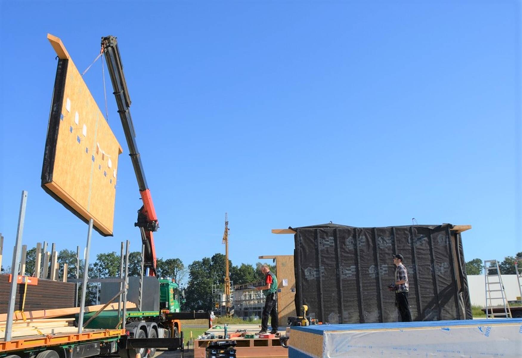 Bei strahlend blauem Himmel und stetig steigenden Temperaturen wurde jetzt ein Modulhaus von der Firma Holzbau Janssen in Werlte aufgestellt. Zügig schwebten die Wände, die mit neuen Dämmmaterialien gefüllt sind, mittels eines Krans auf die dafür vorgesehene Plattform. Das Modulhaus ist Teil des deutsch-niederländischen, von der EU im INTERREG VA-Programm geförderten Projekts „Bioökonomie – Grüne Chemie".