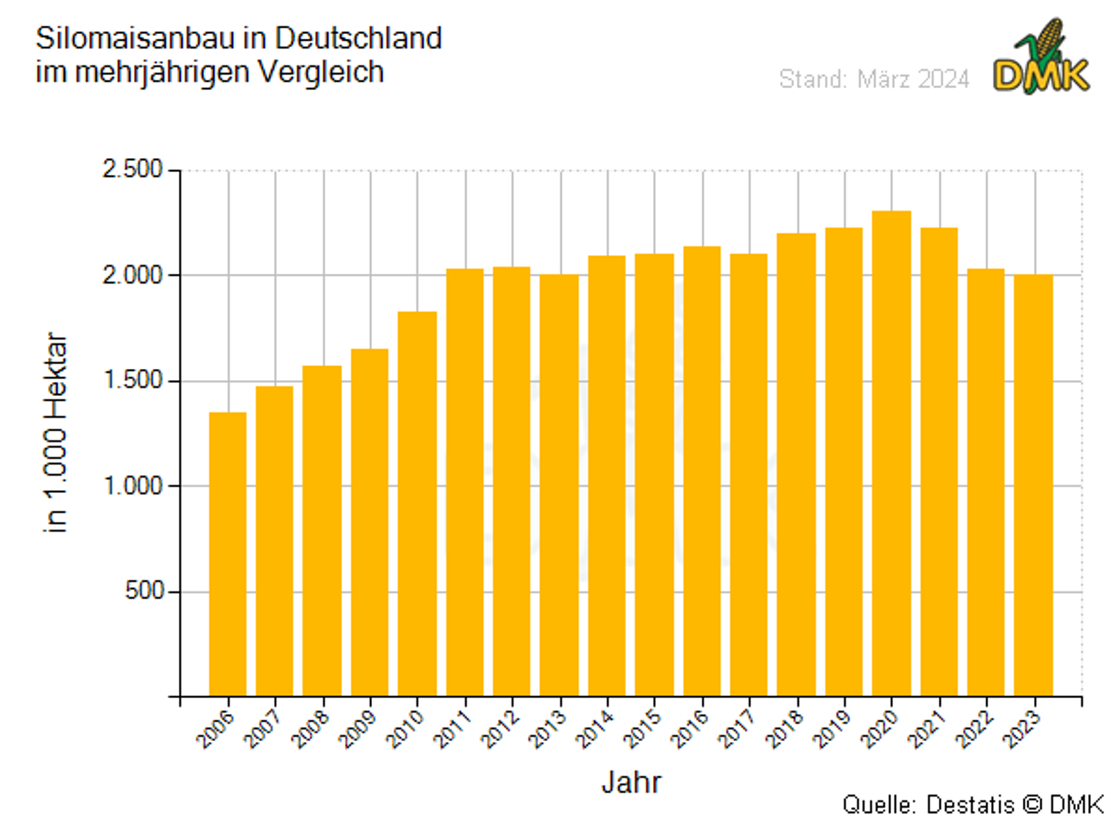 Die Körnermaisfläche ist 2023 in Deutschland im Vergleich zum Vorjahr um 9.700 ha (+ 2,1 %) auf insgesamt 466.400 ha angestiegen. Nach dem extremen, trockenen und heißen Jahr 2022 legte der Flächenertrag von Körnermais im Mittel um 12,5 dt/ha (+ 14,9 %) auf insgesamt 96,5dt/ha im Jahr 2023 zu. Diese Entwicklung schlägt sich auch in den Erntemengen nieder. So ist die geerntete Menge Körnermais von rund 3,8 Mio. t (2022) auf 4,5 Mio. t (2023) um 17,2 % gestiegen.