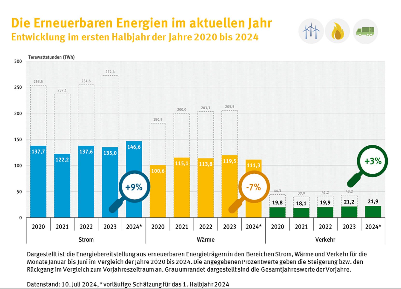 Aktuelle Zahlen des Umweltbundesamtes (UBA) zum ersten Halbjahr 2024 zeigen: Die Stromerzeugung aus erneuerbaren Energien nahm um neun Prozent gegenüber dem Vorjahreszeitraum zu. Für die Klima- und Energieziele muss der Leistungszubau jedoch weiter beschleunigt werden. Im Wärmesektor sorgte eine milde Witterung für geringeren Heizbedarf. Im Bereich der Mobilität stieg die Nutzung erneuerbaren Stroms im Verkehr leicht an.
