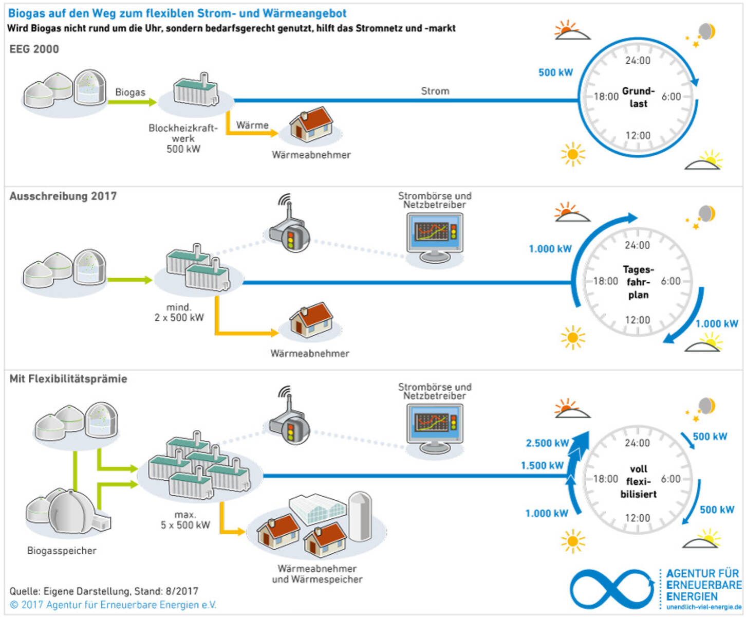 Die flexible Stromproduktion aus Bioenergie ist nicht nur für das Stromsystem der Zukunft ein zentraler Baustein. Sie kann sich selbst unter den heutigen Rahmenbedingungen für Anlagenbetreiber rechnen. Das ist ein zentrales Ergebnis der „Bewertung von Flexibilisierungskonzepten für Bioenergieanlagen“, einer Studie, die das Deutsche Biomasseforschungszentrum (DBFZ) im Auftrag der Agentur für Erneuerbare Energien (AEE) durchgeführt hat. „Damit die Bioenergie ihre Möglichkeiten zum Ausgleich der schwankenden Produktion aus Wind- und Solarenergie künftig verstärkt ausschöpft und damit zum Update der Energieversorgung beiträgt, benötigen die Anlagenbetreiber Planungssicherheit und ausreichende Erlöse am Strommarkt“, sagt Philipp Vohrer, Geschäftsführer der Agentur für Erneuerbare Energien (AEE).