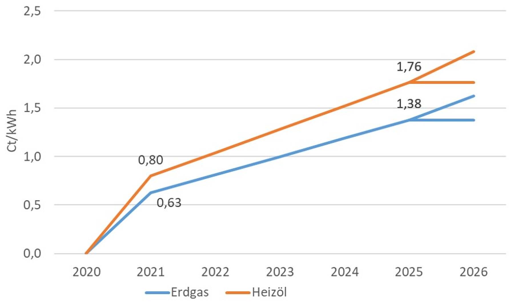 Zudem wird ab 2021 eine erhöhte Energiesteuer aufgrund der CO2-Bepreisung gemäß dem Klimapaket der Bundesregierung eingeführt. Die Grafik zeigt den Verlauf der Zuschläge ausgehend von den Vorgaben in Höhe von 25 € je t CO2 im Jahr 2021 und 55 €/t 2025. Ab 2026 ist ein Marktwert im Bereich von 55 - 60 €/t vorgesehen. Die höheren Werte für Heizöl spiegeln den erhöhten CO2-Ausstoß dieses Energieträgers wider.