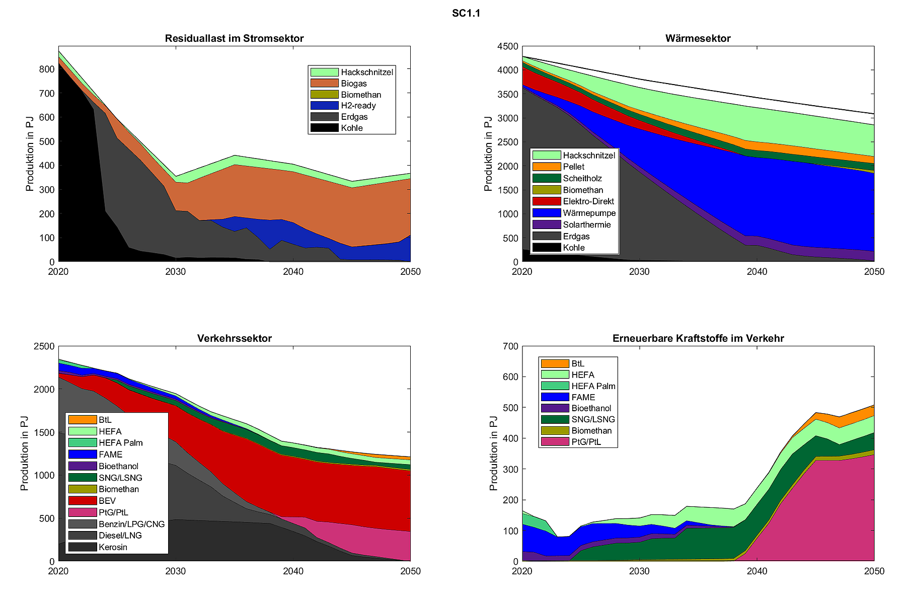 Laut dem verwendeten BENOPT-Modell wird im Wärmesektor die größte Biomassemenge in Form von Hackschnitzeln aus Holzreststoffen und Miscanthus für Hochtemperatur-Industrieanwendungen genutzt. Im Stromsektor ist der Einsatz von Biogas aus heimischen vergärbaren Rest- und Abfallstoffen oder Mais sowie geringere Mengen Altholz in Altholzheizkraftwerken zur flexiblen Bedarfsdeckung der Residuallast langfristig die kosteneffizienteste Option. Im Verkehrssektor sollte der Straßen- und Schienenverkehr kostenoptimal elektrifiziert werden. Langfristig wird Biomasse so als Biokerosin im Flugverkehr und als verflüssigtes Biomethan im Schiffsverkehr eingesetzt.