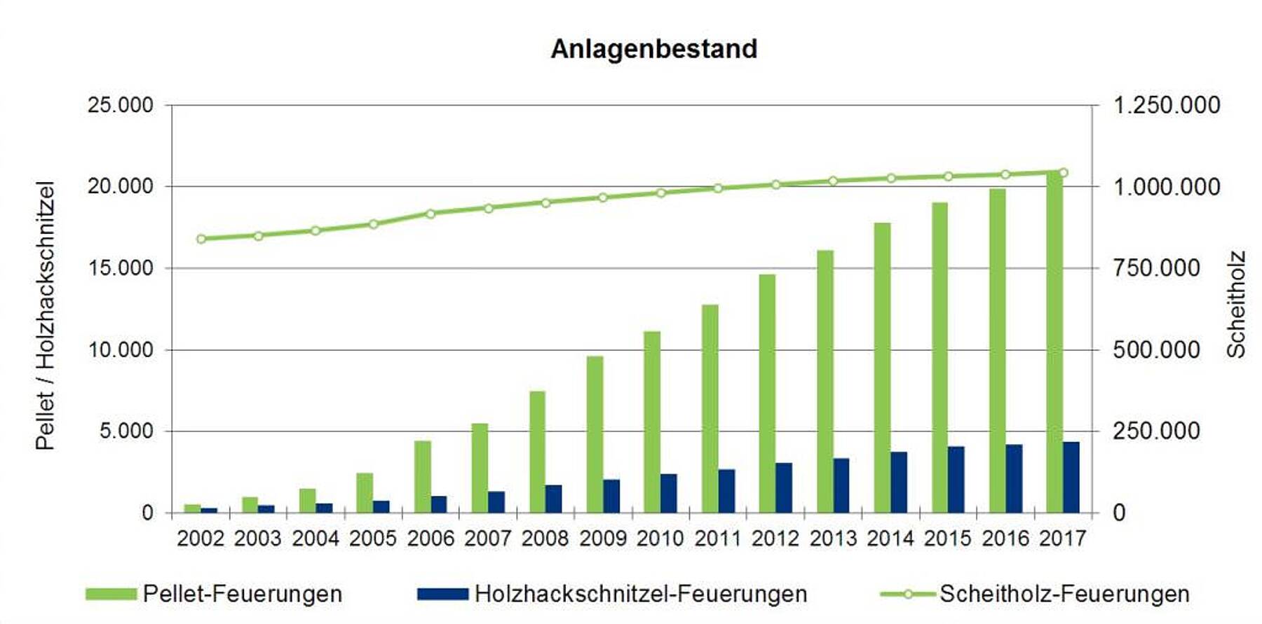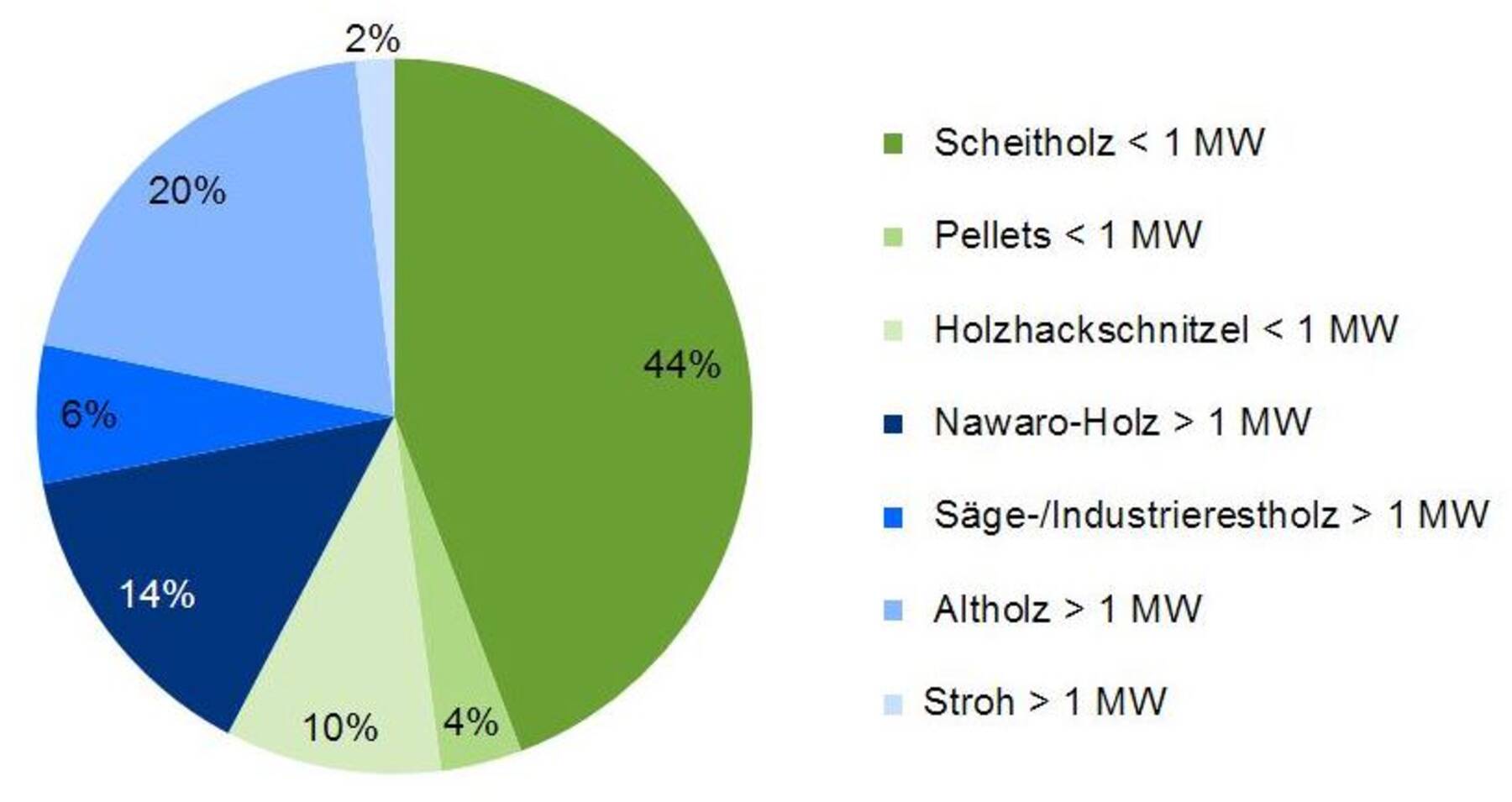 In Niedersachsen wachsen jährlich rund 12,3 Mio. Festmeter Holz nach, von denen rund 9,2 Mio. geerntet werden. Der Holzverbrauch der Anlagen unterhalb 1 MW wird auf etwa 3 Mio. Festmeter geschätzt, wobei sich diese Menge zu 78 % auf Scheitholz, 13 % auf Holzhack-schnitzel und 9 % auf Holzpellets verteilt. Es muss berücksichtigt werden, dass in Scheitholz- bzw. Holzhackschnitzelfeuerungen auch Holzbriketts, Sägeresthölzer, Holz aus der Garten- und Landschaftspflege sowie naturbelassene Althölzer eingesetzt werden. 73 % des in Anlagen unterhalb 1 MW Feuerungsleistung eingesetzten Holzes stammen aus dem Wald, 88 % als Scheitholz und 12 % als Hackschnitzel. 17 % des Holzes werden als Nebenprodukt einer Verarbeitungsstufe oder nach einer stofflichen Nutzung gewonnen. Hierzu zählen auch Holzpellets, die überwiegend aus Sägenebenprodukten hergestellt werden.