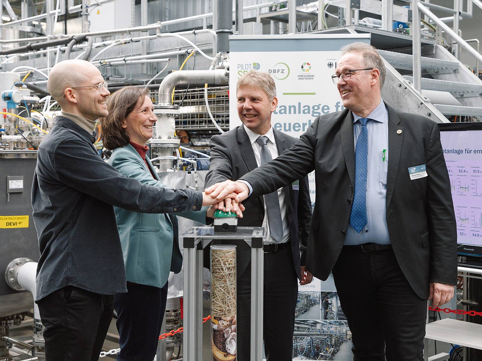 Die auf einer Gesamtfläche von rund 800 Quadratmetern errichtete Pilotanlage auf dem Gelände des DBFZ dient u.a. dem Erkenntnisgewinn zum Zusammenspiel von Komponenten und Apparaten oder dem Einfluss von Prozessparametern auf dessen Stabilität und Ausbeute. Ihre Kapazität ist so gewählt, dass sie eine für Forschung und Entwicklung (F&E) ausreichende sowie kostentechnisch darstellbare Flexibilität mit sich bringt. Mit der technischen Möglichkeit zur Darstellung der gesamten Prozesskette in einer einzelnen Anlage ist die nun in Betrieb genommene Anlage in dieser Größenordnung deutschlandweit einzigartig. Im Rahmen eines offenen Rundganges konnten sich die Besucher:innen über das Anlagenkonzept informieren und sich die zentralen Module „Anaerobe Vergärung“, „Hydrothermale Prozesse“, „Methanisierung“ sowie „Trennverfahren der Gärrestaufbereitung“ durch die wissenschaftlichen und technischen Expert:innen des DBFZ präsentieren lassen.