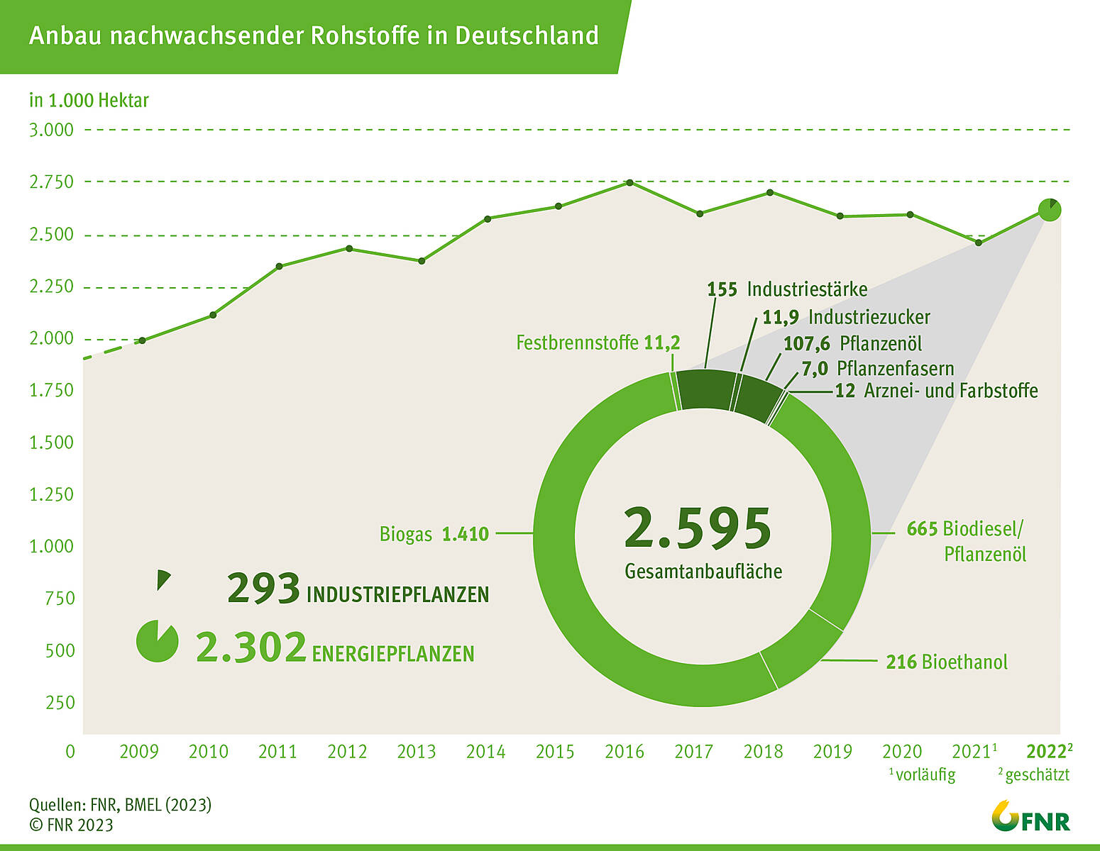 Überwiegend stabil blieben die Anbauflächen für Festbrennstoffe vom Acker wie Miscanthus oder schnellwachsende Baumarten sowie für zucker- oder wirkstoffliefernde Pflanzen für technische Zwecke und Phytopharmaka. Ölpflanzen für die stoffliche Nutzung legten hingegen zu, insbesondere wuchs die Sonnenblumen-Fläche auf mehr als das Doppelte gegenüber dem Vorjahr. Ein möglicher Erklärungsansatz sind hier zurückgehende Importe aufgrund des Ukrainekrieges.