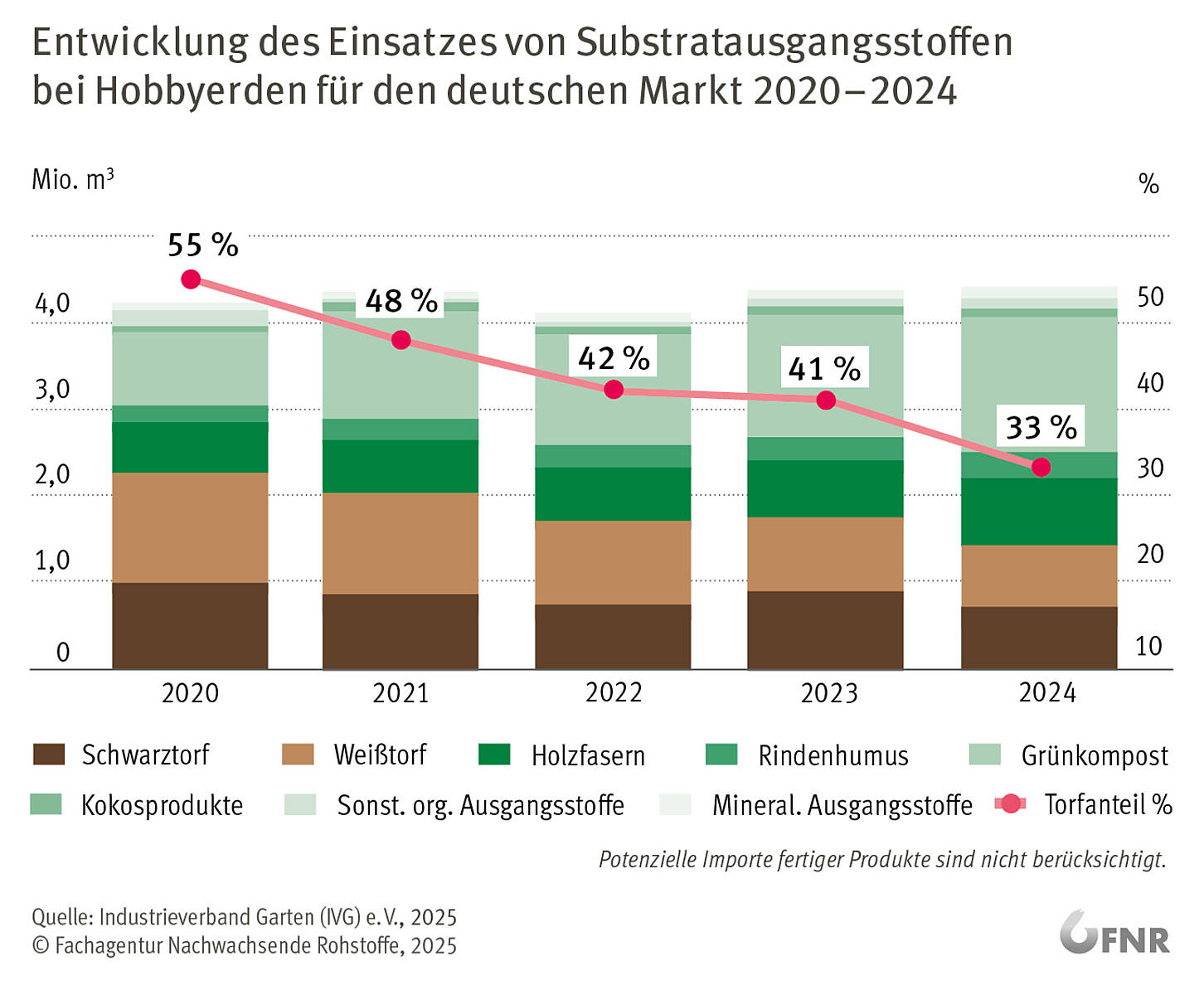 Im Detail unterscheiden sich der Erwerbs- und der Hobbygartenbau im Hinblick auf den Torfausstieg erheblich voneinander. In den Kultursubstraten des professionellen Gartenbaus legte der Anteil von Torfersatzstoffen – im Wesentlichen sind das Holzfasern, Grüngutkompost und Kokosprodukte - in den letzten Jahren geringfügig zu. Im Hobbybereich ist der Einsatz von Torf in den letzten Jahren hingegen deutlich rückläufig. So sank der Anteil von Torf in Hobbyerden zwischen 2021 und 2024 von fast 50 Prozent auf ca. ein Drittel und wird vor allem durch den erhöhten Einsatz von Grüngutkompost substituiert.