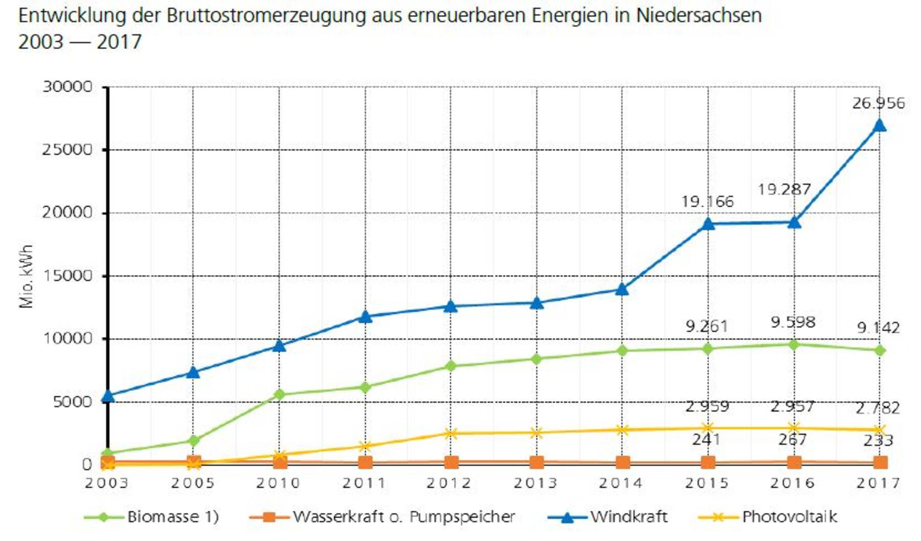 In Deutschland wurden 2017 nach vorläufigen Angaben insgesamt 216,3 Mrd. Kilowattstunden Strom aus regenerativen Energieträgern produziert. Mit 39,1 Mrd. Kilowattstunden aus Niedersachsen hielt das Land einen Erzeugungsanteil von 18,1%.