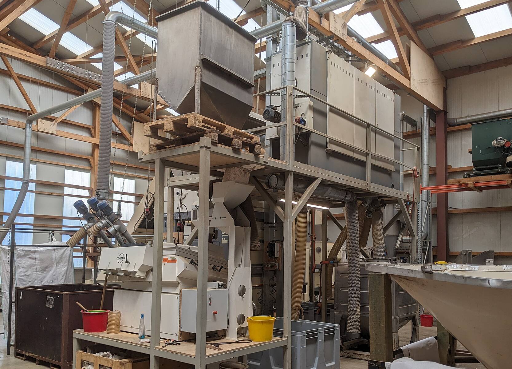 Anlage zur Sortierung und Reinigung von Saatgut Eine besondere Kunst ist die Ausbereitung des Erntegutes: Die teilweise sehr kleinen Kräutersamen müssen mit Spezialmaschinen gereinigt, sortiert und verpackt werden. Die Sortierung kann mit verschiedensten Siebanlagen, aber auch mit optischen Techniken erfolgen. Diese dafür erforderlichen Investitionen lohnen sich nicht für Betriebe, die nur wenige Hektar Kräuter anbauen. Hier ist es sinnvoller, sich eines spezialisierten Dienstleisters bedienen. (siehe Beispiel Hof Grote )