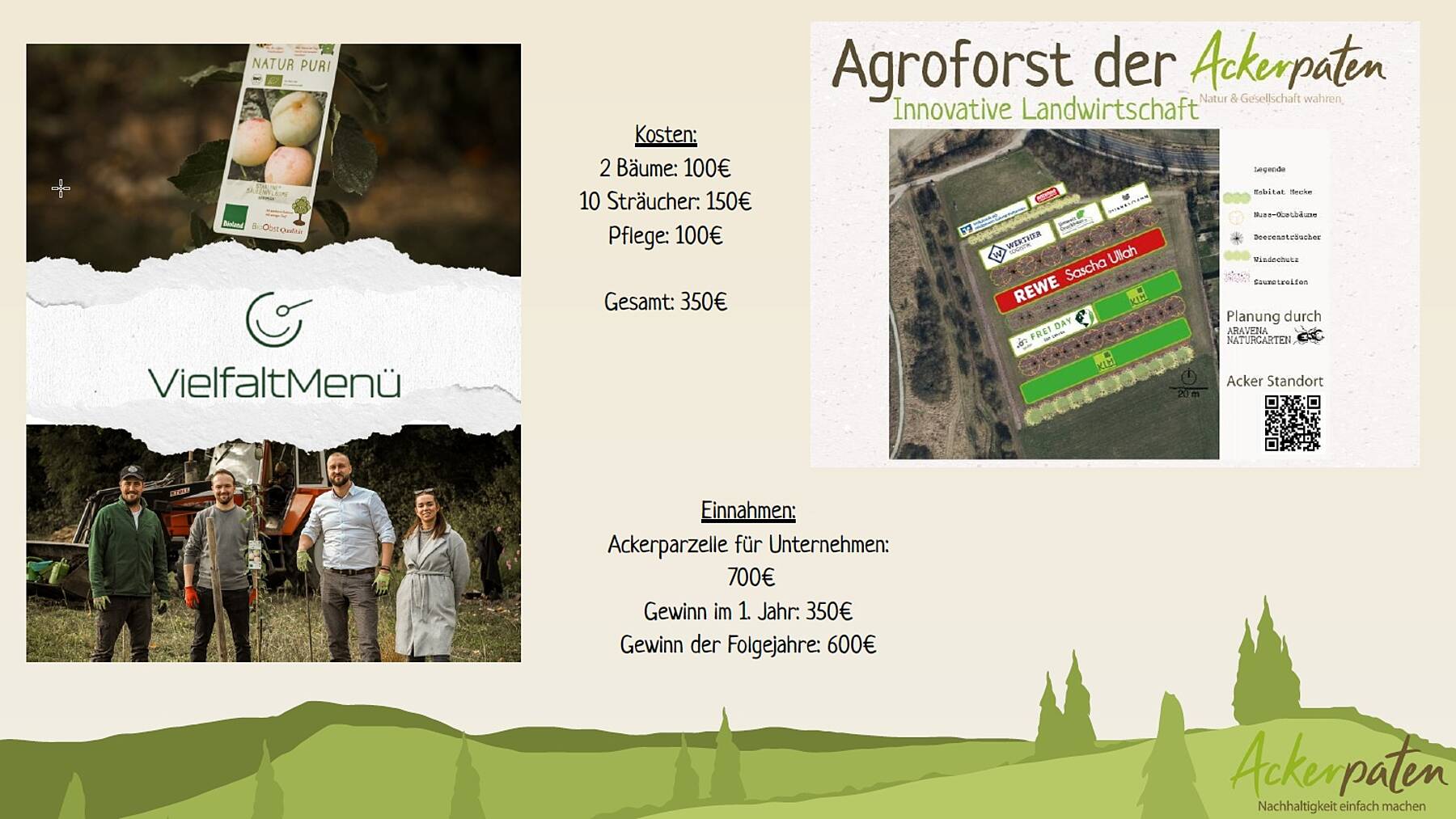 Ein Beispiel dafür, wie intensiv man die Kommunikation mit der Bevölkerung bzw. einzelnen Sponsoren betreiben und damit sogar ein eigenes Geschäftsfeld aufbauen kann, ist der Betrieb von Christian Bruns in der Nähe von Hannover mit seinen „Ackerpaten“. (www.ackerpaten.com) Auch er hat eine Blühwiese im Bestand und berichtete beim der KlimaFarming-Abschlusstagung auf der AGRITECHNICA am 12.11.2025 über seine Einnahmen und Ausgaben bei der Anlage einer Strueobstwiese: